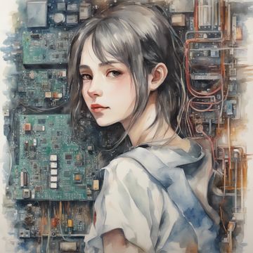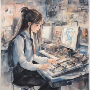 この鮮やかな水彩画は、テクノロジーとクリエイティビティの交差点に立つ一人の女性を捉えています。 彼女は、電*工作のプロジェクトに没頭しており、その繊細な手つきでコンポーネントを組み立てています。 画面からは、彼女の集中*と創造*が感じ取れ、見る者を魅了します。この作品は、科学技術とアートの美しい調和を表現しており、 テクノロジーに情熱を注ぐすべての女性へのオマージュです。画家の繊細な筆使いにより、